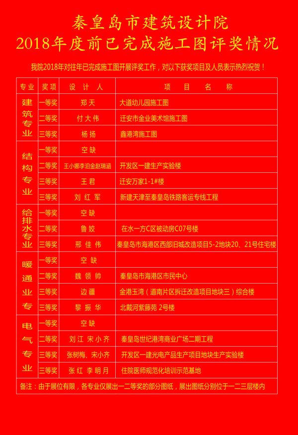 截止到2018年3月5日,活動最終按照各專業(yè)分別評選出了一、二、三等獎,評選結果和獲獎的優(yōu)秀施工圖分別在大堂進行了公示。